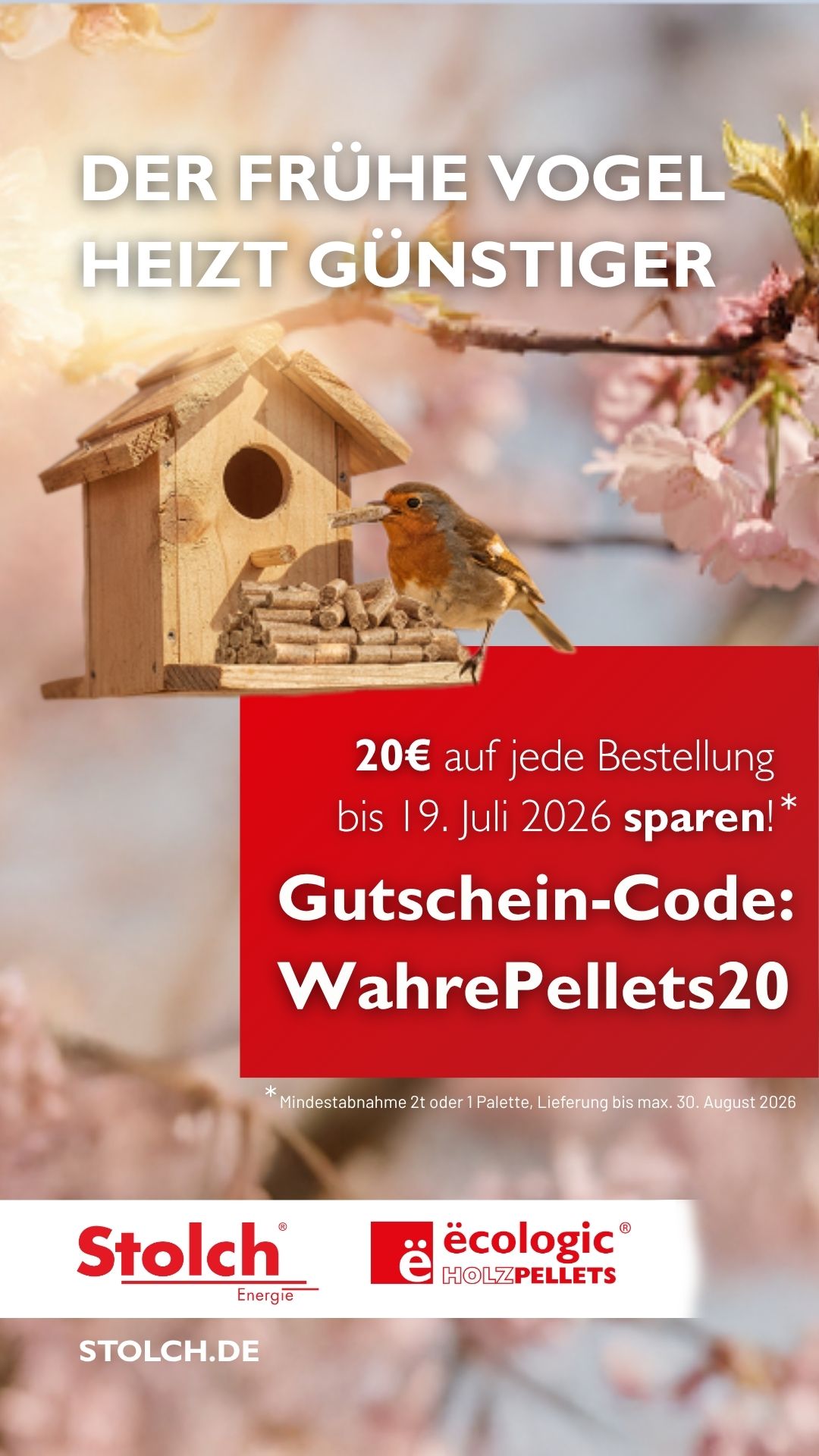 Im Rahmen der Pellets-Frühjahrsaktion erhalten Kundinnen und Kunden 20 Euro auf jede Bestellung bis 19. Juli 2026. Dafür muss bei der Bestellung einfach der Gutschein-Code „WahrePellets20“ angegeben werden. Bestellt werden kann telefonisch unter 07362 95695-0, per E-Mail an in**@****ch.de oder direkt über die Website www.stolch.de. Die Aktion gilt bei einer Mindestabnahme von 2 Tonnen oder 1 Palette und bei Lieferung bis maximal 30. August 2026. Diese Aktionsdetails stammen aus deinen Angaben für die Anzeige.